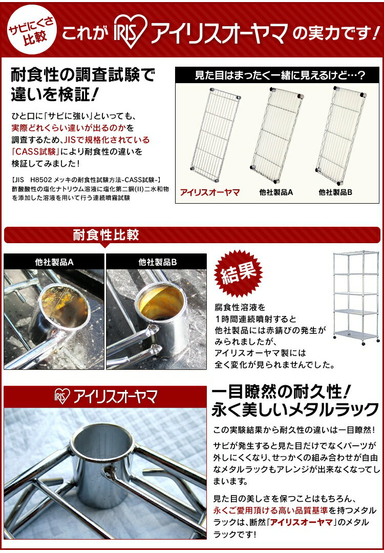 ●商品サイズ(cm):幅100×奥行46●耐荷重:棚板1枚あたり 約250Kg●主要材質:スチール+クロームメッキ仕上げ、●付属品:棚板固定部品 4組「メタルラック」はアイリスオーヤマ株式会社の登録商標または商標です。