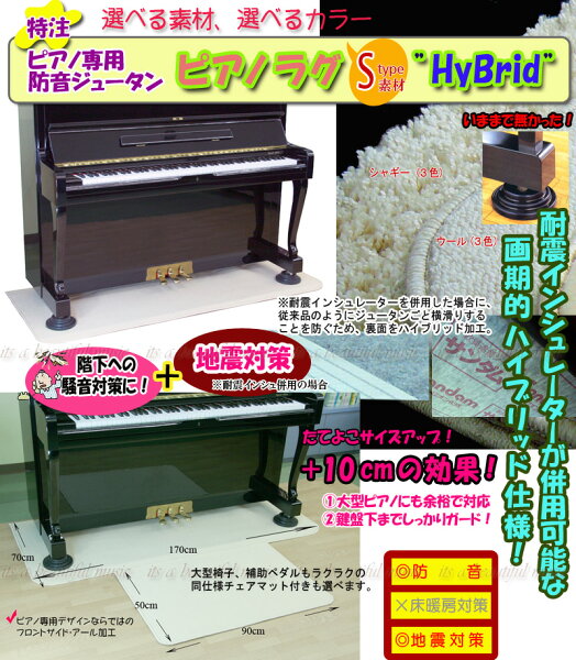 【商品情報】 ◆商品名 ピアノ専用防音ジュータン ”ピアノラグ” 【Sタイプ】・防音+ハイブリッド仕様 ◎防 音 ×床暖房対策 ◎地震対策 ◆アドバイス 【防音仕様】 防音ジュータンでおなじみ、音楽系の遮音でよく使われるサンダムKR防音シートで仕上げました。